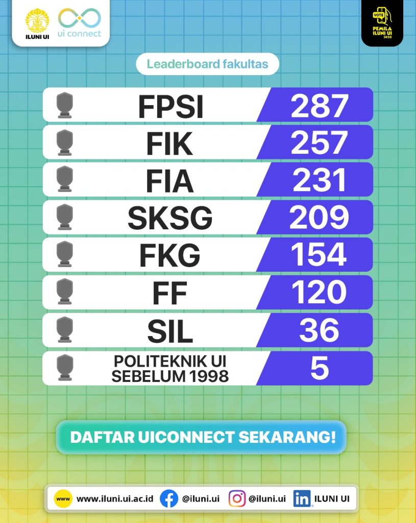 Halo Abang & Mbak! Saat ini ada 16.061 jumlah akun UI Connect yang tervalidasi dan siap untuk mengikuti e-vote Pemila ILUNI UI 2025 pada 23-24 Agustus 2025. Sudahkah UI Connectmu tervalidasi?